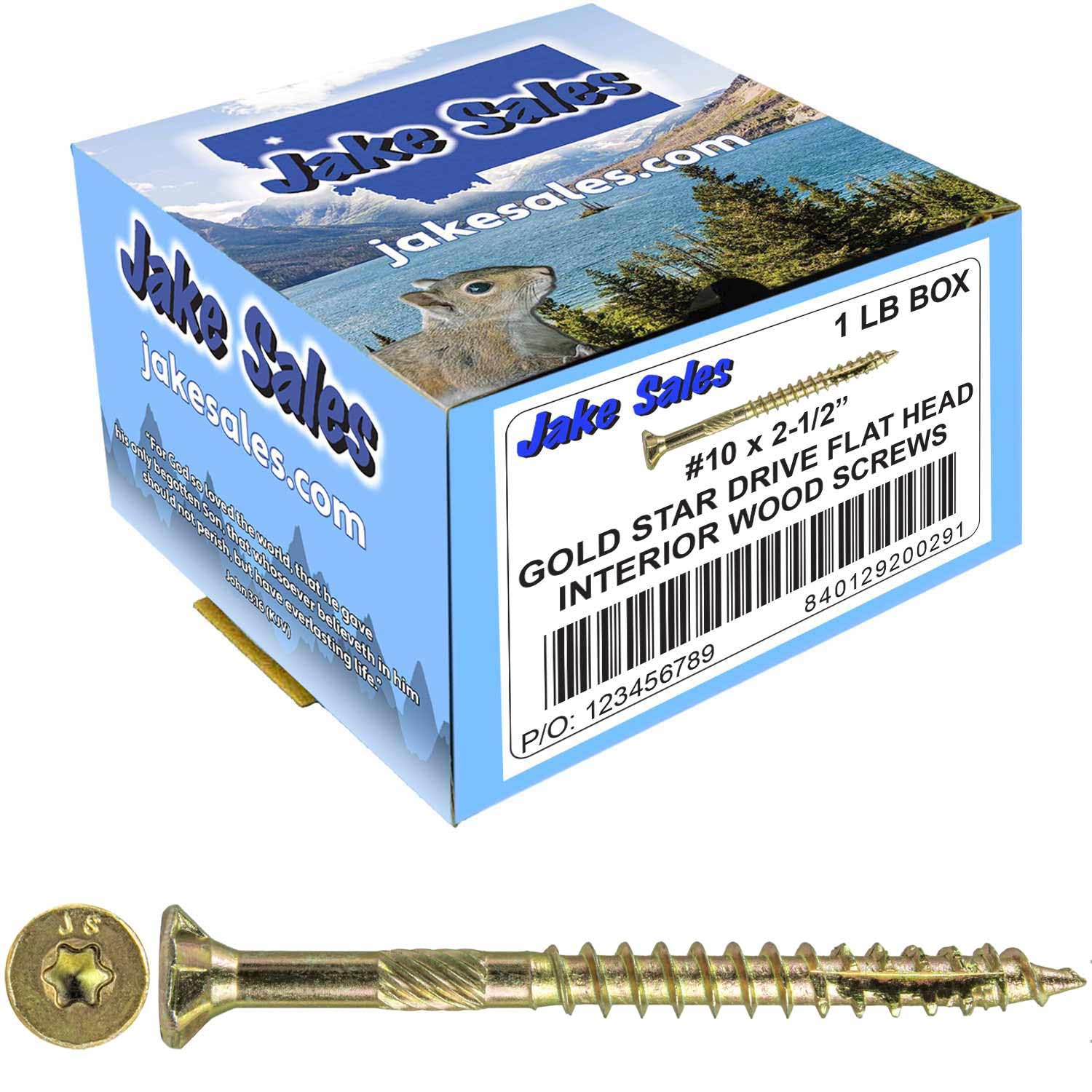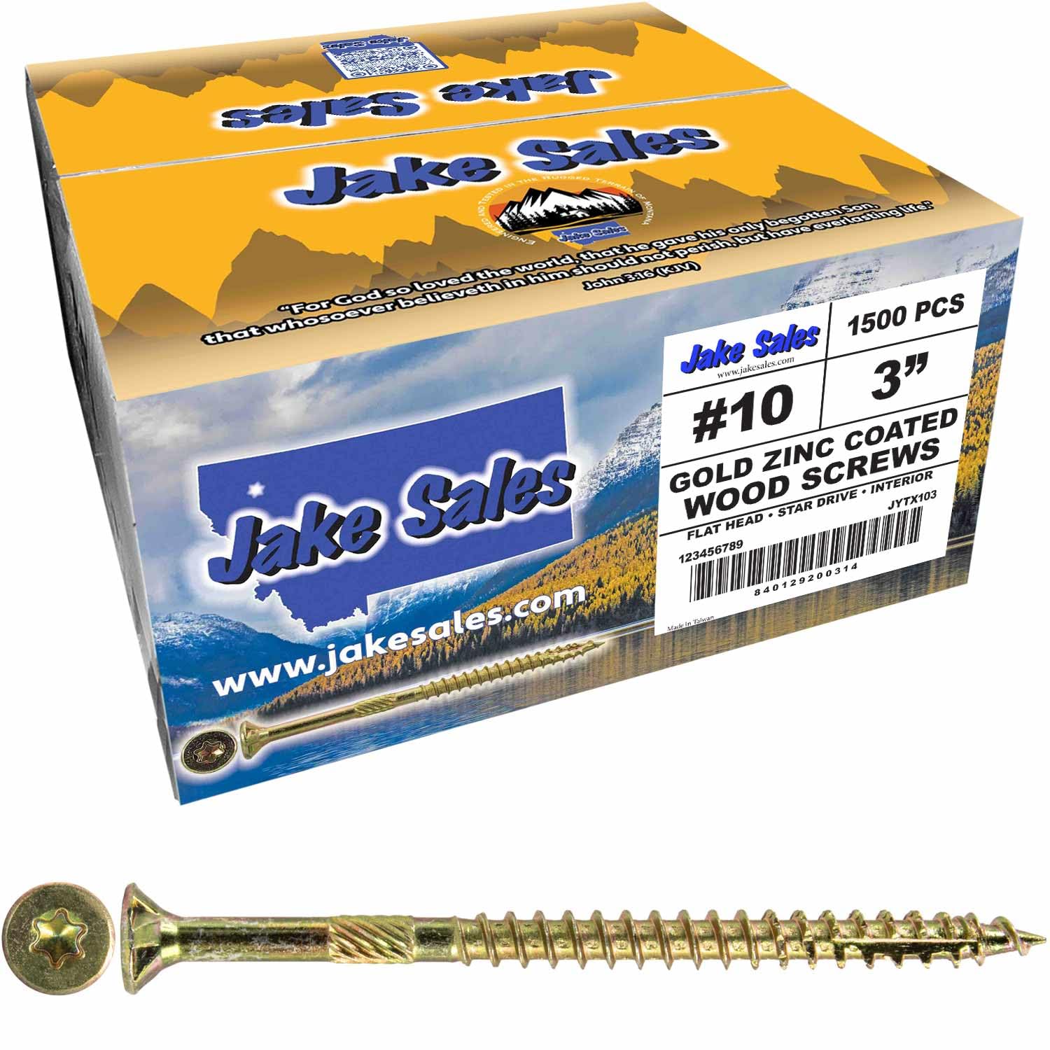 Jake Sales #10 X 3" Gold Star Wood Screw Torx/Star Drive Flat Head - Multipurpose Torx/Star Drive Wood Screws - CASE QTY 42 BOXES 2,646 SCREWS-Dimensions: Shank Diameter .190" - Item Width and Height 0.38 - Use T25 Torx/Star Drive Bit-Multipurpose Yellow Zinc Triple Coated Screws, Excellent Screws, for Both Hard and Soft Wood-Screws are Manufactured from High Quality Heat Treated Steel With a Self-Countersinking Screw Head-Deep, Wide, Sharp Threads Provide Maximum Holding Power Cut Clean and Easy Through Tough Materials-Knurled Screw Shoulder Lowers Drill Torque Requirements (10 x 2" and above)-Type 17 Notched Sharp Screw Point for Quick Starts without "Walking" and Eliminates Pre-Drilling-Deep Torx/Star Drive Head Reduces "Cam-out" When Driving Screw During Installation-Torx/Star Drive Wood Screw Head Provides Twice the Torque of Phillips or Square Drive Screw Heads-Excellent Screw for Cabinetry, Furniture, Roofing, and Framing Gold Star Yellow Zinc Multipurpose Torx/Star Drive Wood Screws"YTX" #10 x 3" Wood Screws with a .38" Diameter Torx Drive Head. Use the T25 Torx/Star Drive Bit for Installing these Quality Wood Screws. Our Gold Star Torx/Star Drive Screws are an Excellent Fastener for Multipurpose Applications in Hard and Soft Woods, Chipboard, and other Tough Materials. These Gold Zinc Coated Wood Screws are a Rugged Fastener for Professional Operations and Demanding Industries. Uses include, cabinetry, framing, furniture, and other Applications. Our Wood Screws are so Strong they can even be Removed and Reused. Screw Engineering Specs:Average Shear Strength of #10 Shank ---- 2399 lbsAverage Pull-Out Strength ----------------- 1391 lbs (Screw Pull-Out is Calculated with a 3" Length Screw in the wood species: Yellow Pine Wood)