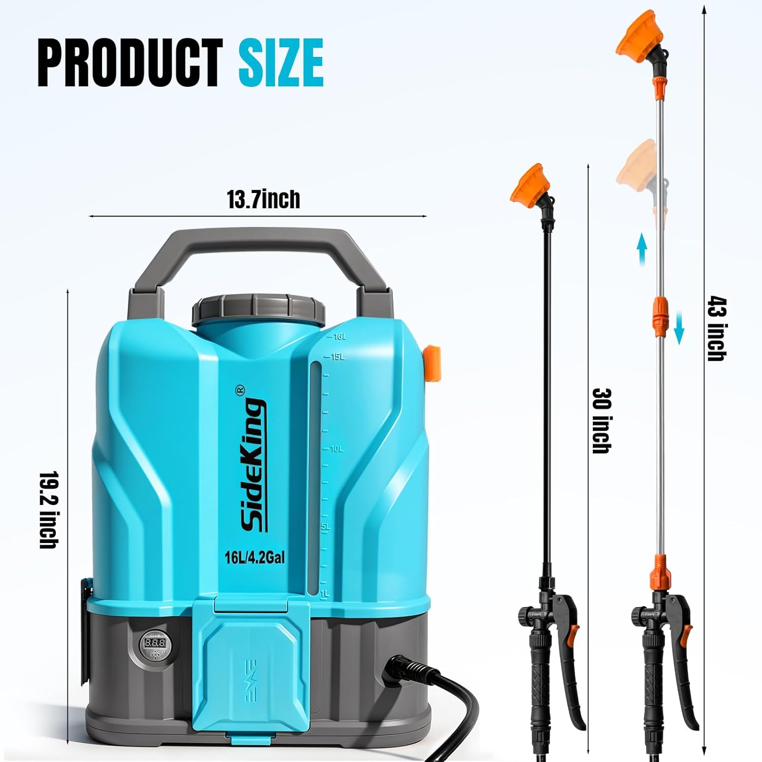 | Included Components | 5 Nozzles: Fan Nozzle, Cone Nozzle, Windproof Nozzle, F Type Dual Nozzle, Stream Nozzle; 42.5in Telescopic Wand; 50cm Fiberglass Spray wand; Hose; 2.6Ah Battery; Backpack Strap; 4.2 Gallon Tank, Charger; Instruction Manual |