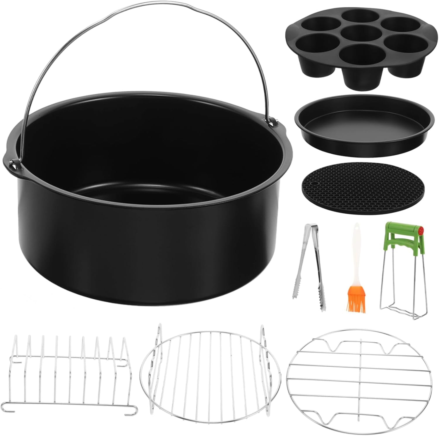 Package List 9 tools Characteristics -Color: Assorted color Pizza Pan -Material: Stainless steel Pizza Cupcake Pan - They are are designed with non-stick coating, which makes them extremely easy to clean Air Fryer Kit. - You can use this set to bake various types of cakes, pies, to cook juicy meat, fish, macaroni and cheese, omelets, etc Kitchen Tools. - A great cooking tool for your kitchen for banana fritters, roasted tomato bruschetta, chicken kebabs with french fries, lamb kebabs with and hummus and so on Air Frying Cooker. - They can be used for not only baking but also for soups, stews, and any foods with juices for flavor Baking . - These pans are made from food-grade material, allowing you to truly enjoy the cooking with the health advantages and versatility Barbecue Rack.Goods InformationCupcake Pan Especially, cake and pizza pan using materials, there is a protective layer on the air fryer accessories surface, don't use hard things to rub, your cake will not have black paint.Barbecue Rack These are practical air fryer accessories, which are specially designed for food frying
