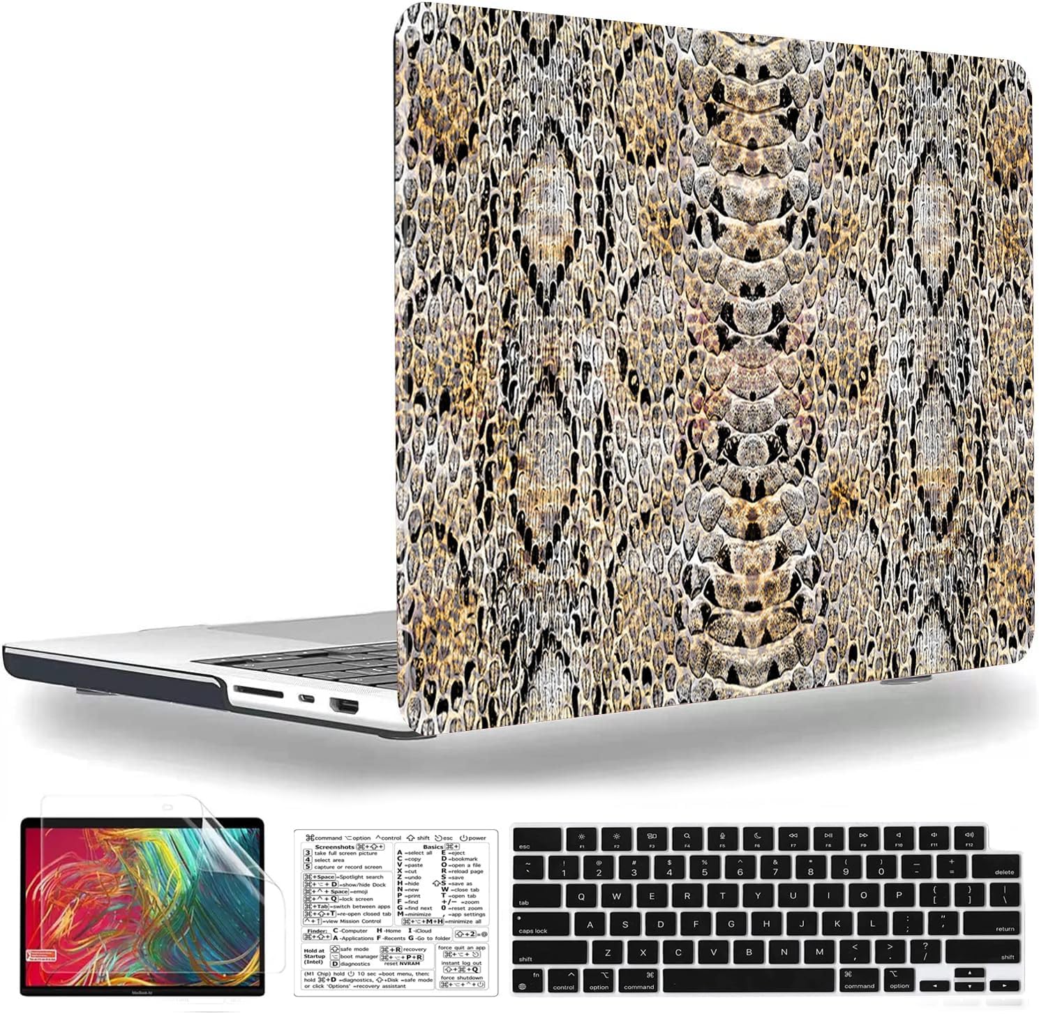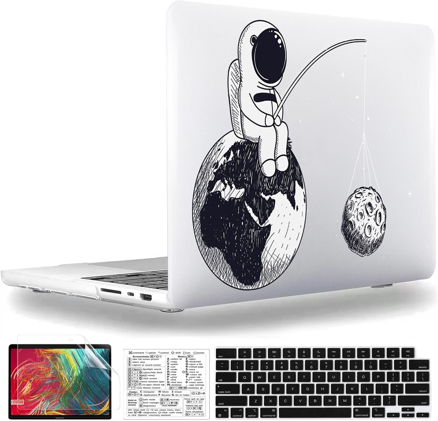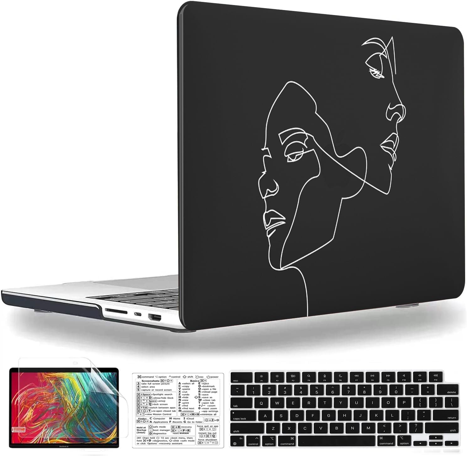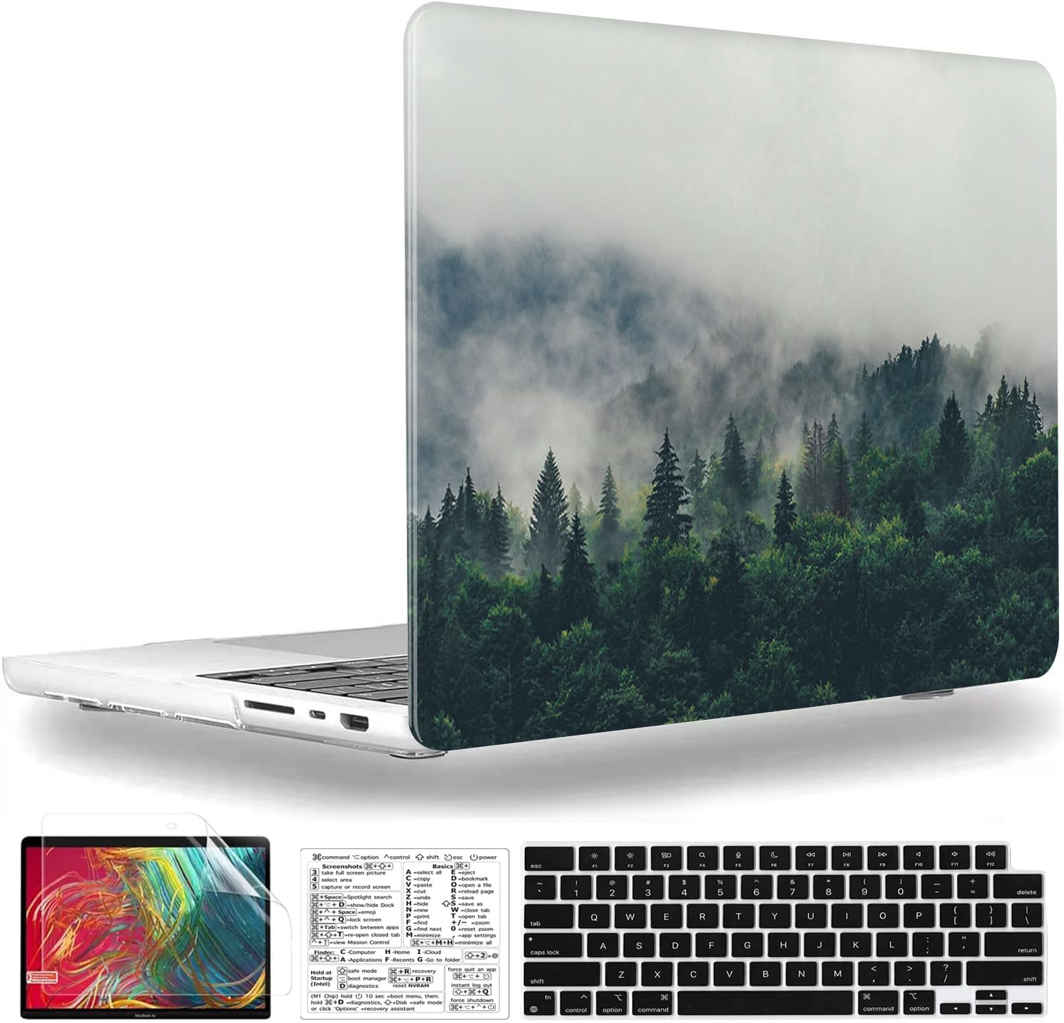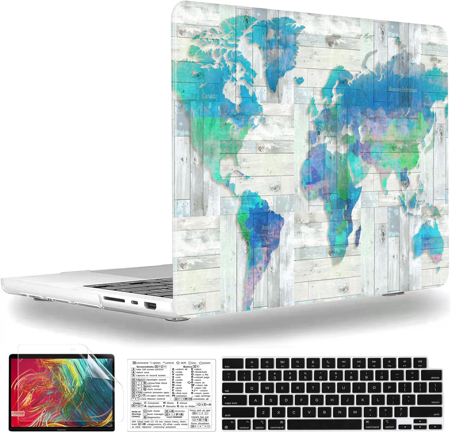 Including 1 matching keyboard cover, 1 screen protector and 1 Mac OS keyboard shortcuts clear vinyl sticker.