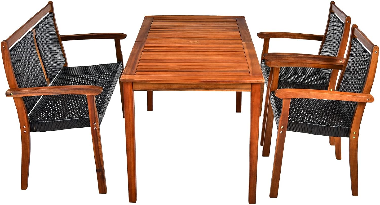 This patio dining set includes a rectangular dining table, large loveseat and 2 comfy armchairs, which creates a cozy place for 4 people sitting together and enjoying delicious food. Besides, the modern design blends with your garden, backyard or deck perfectly.