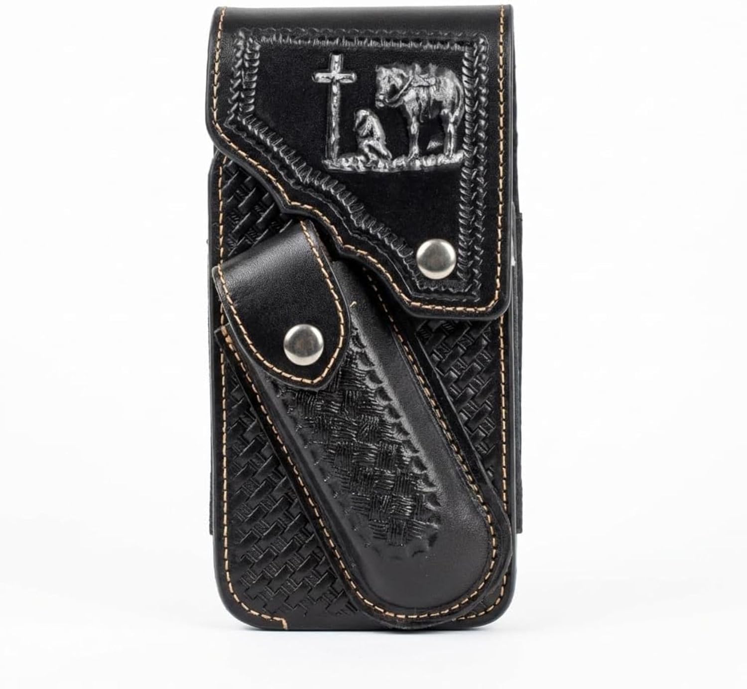 Carry your phone and knife in true Western style with the egifthome Western Leather Phone Belt Holster with Floral Leather Knife Holder—a handcrafted, high-end leather phone pouch designed for durability, functionality, and cowboy flair. Made from premium tooled leather, this rugged yet refined phone case features a secure belt holster design, ensuring your phone and knife stay protected and accessible. Adorned with intricate embossed artwork, choose from Floral, Cowboy Praying at Cross, Longhorn, Horse, or Deer designs that celebrate Western heritage. Available in Brown, Coffee, Black, and Light Brown, this handmade leather case is perfect for cowboys, ranchers, and outdoorsmen who need a durable, stylish, and multi-functional phone holster. Size 7"H X 4"W X 1"DEEP
