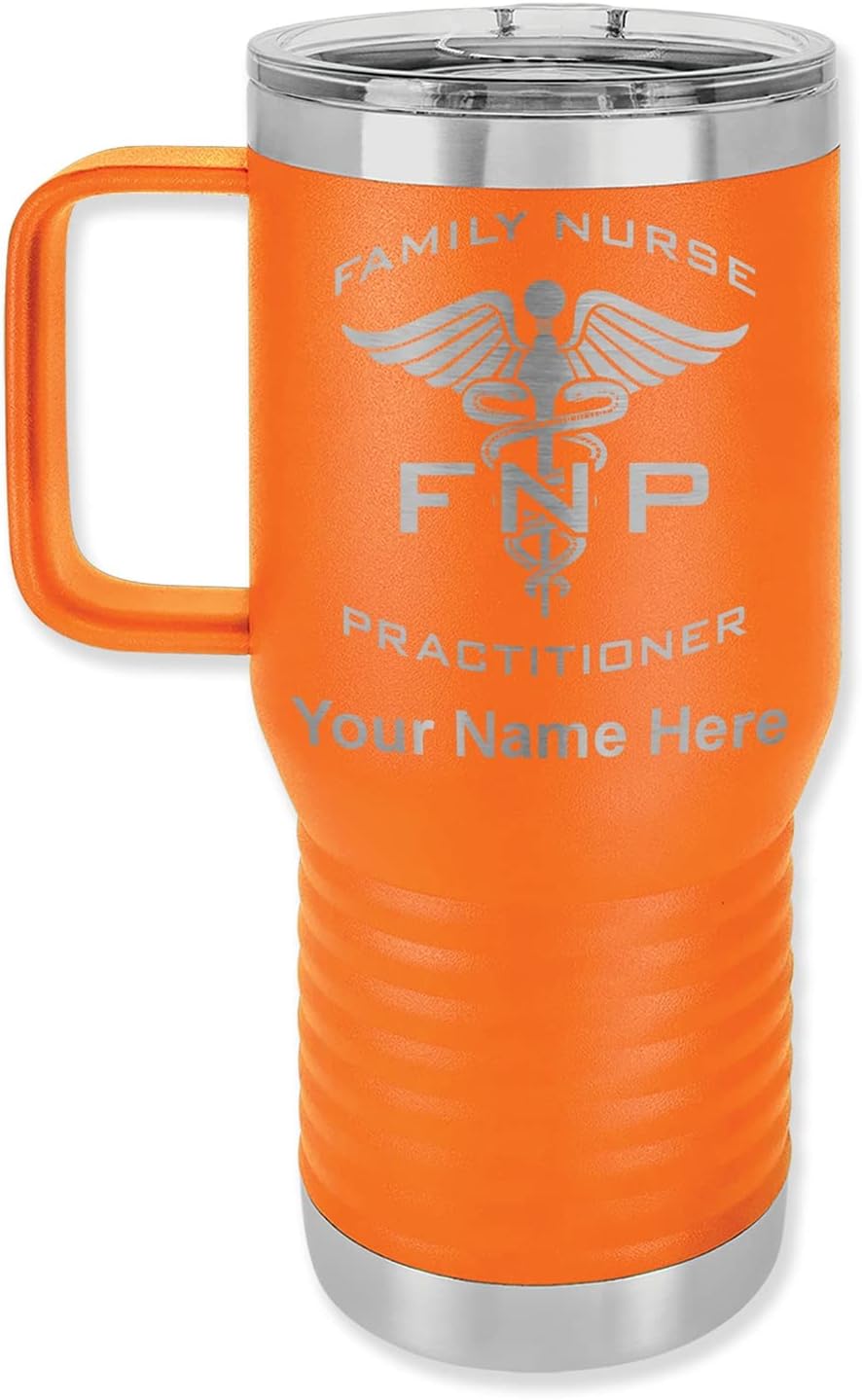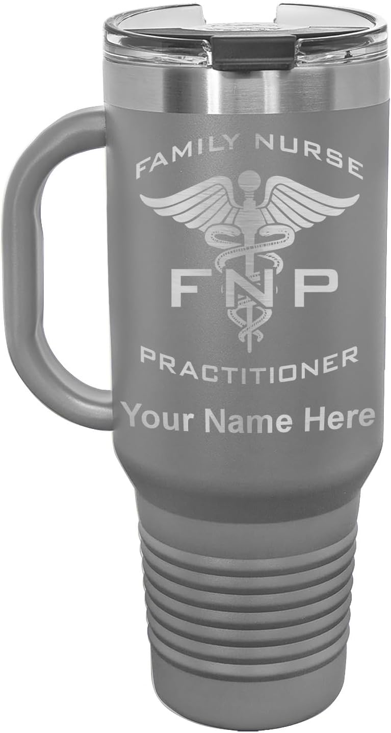 LaserGram 40 ounce Travel Mug with Handle that is laser engraved with the image that you see in the photo. Your own personalized text will be laser engraved below the image. Features double-walled stainless steel vacuum insulation with a clear lid. Click the "Customize Now" button to begin customizing your mug.