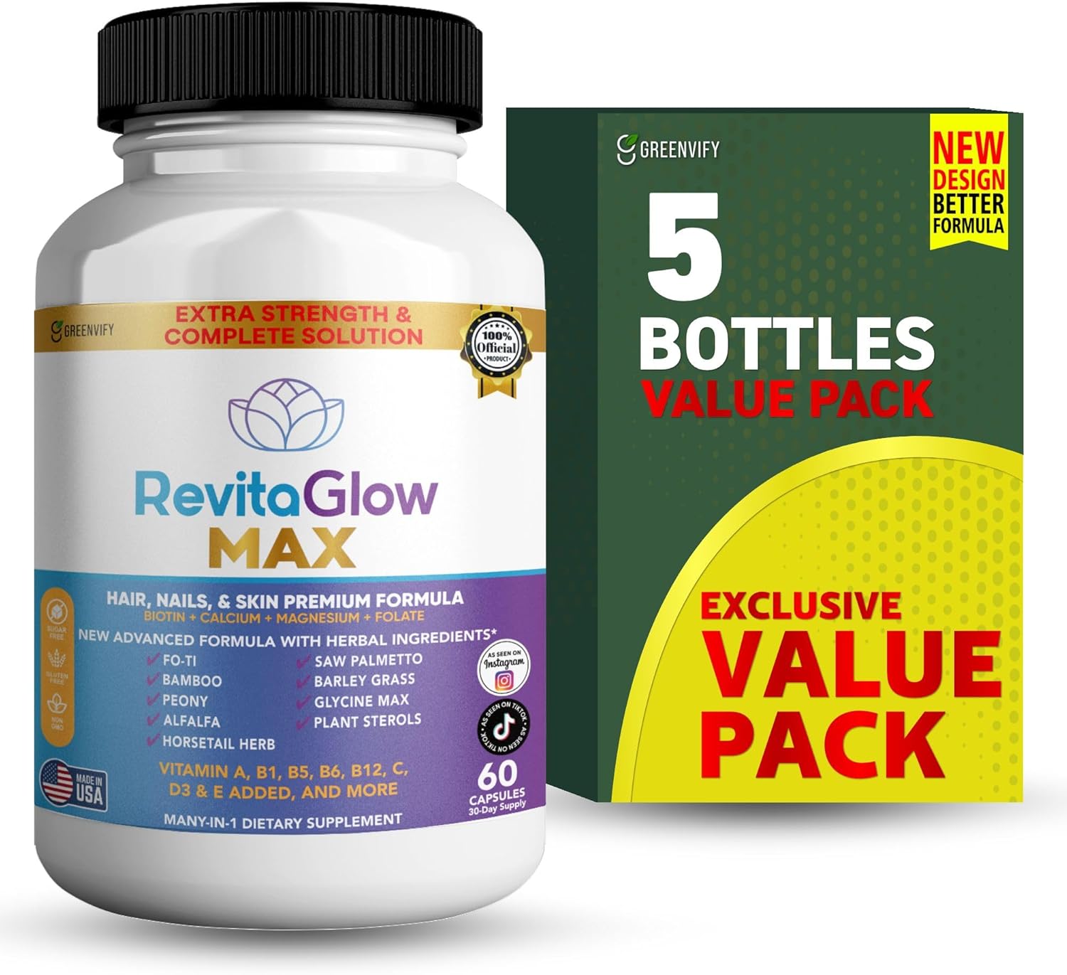 RevitaGlow Max Hair, Nails & Skin Premium Formula, 60 Capsules, 30-Day Supply, with Biotin, Vitamins A, B1, B5, B6, B12, C, D3, E