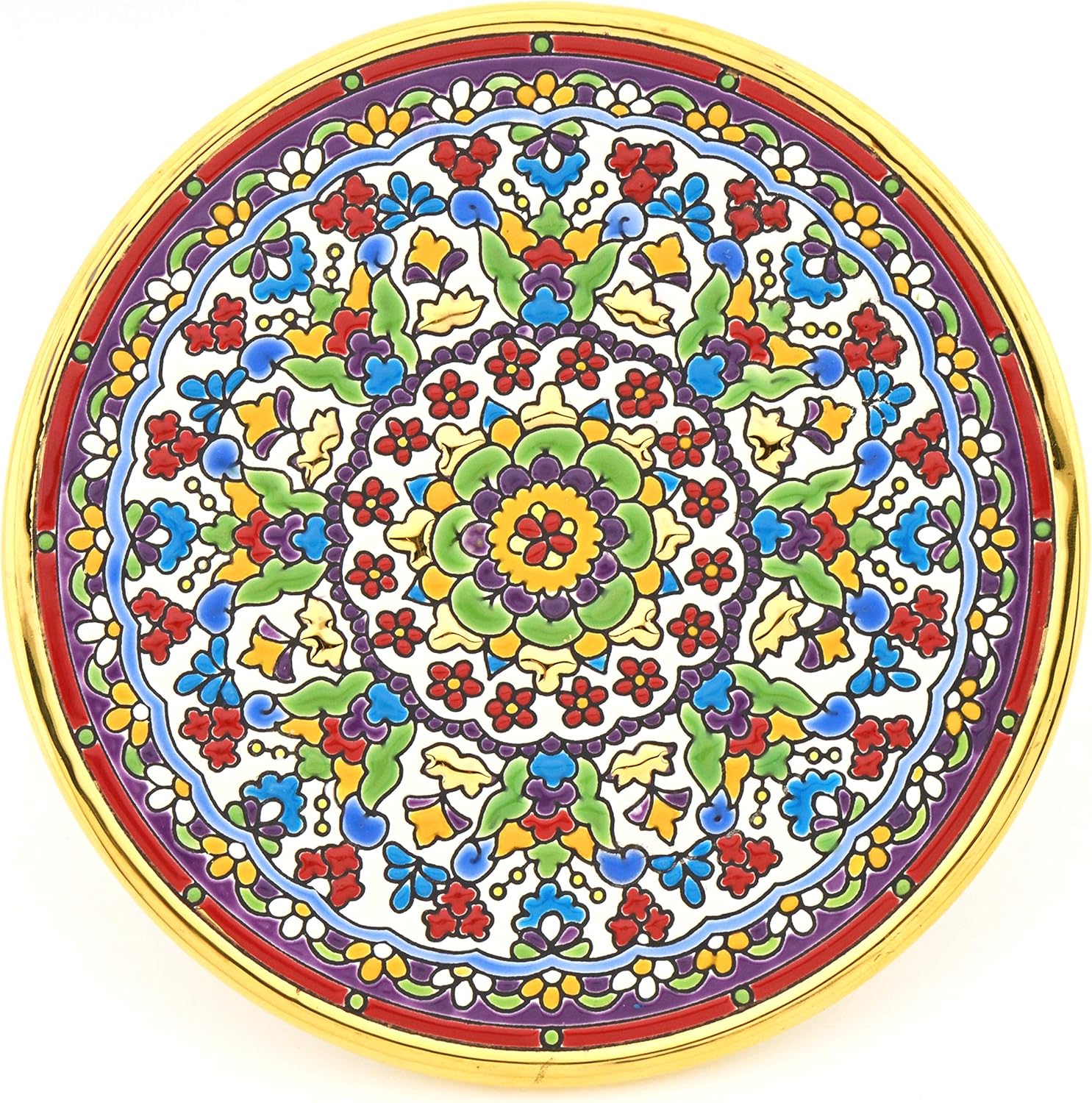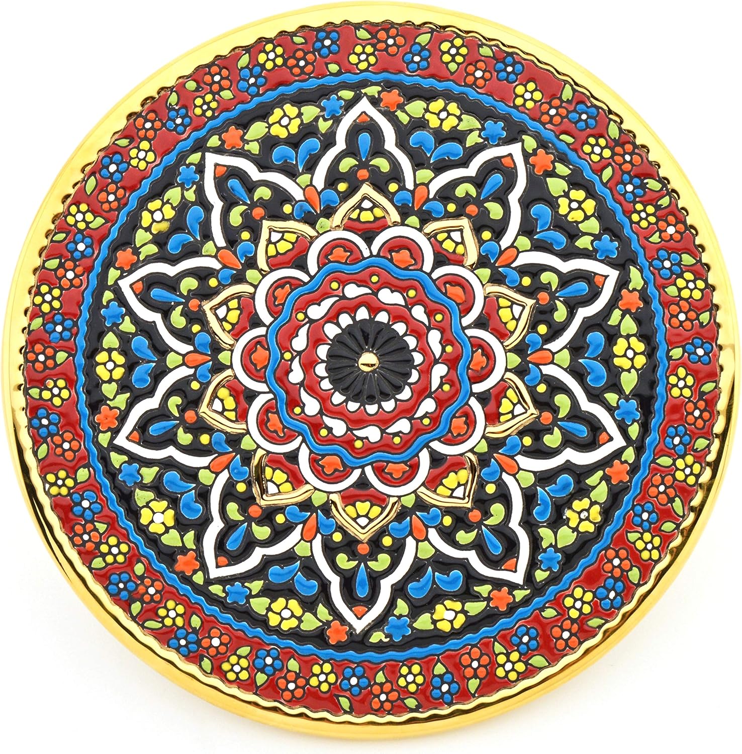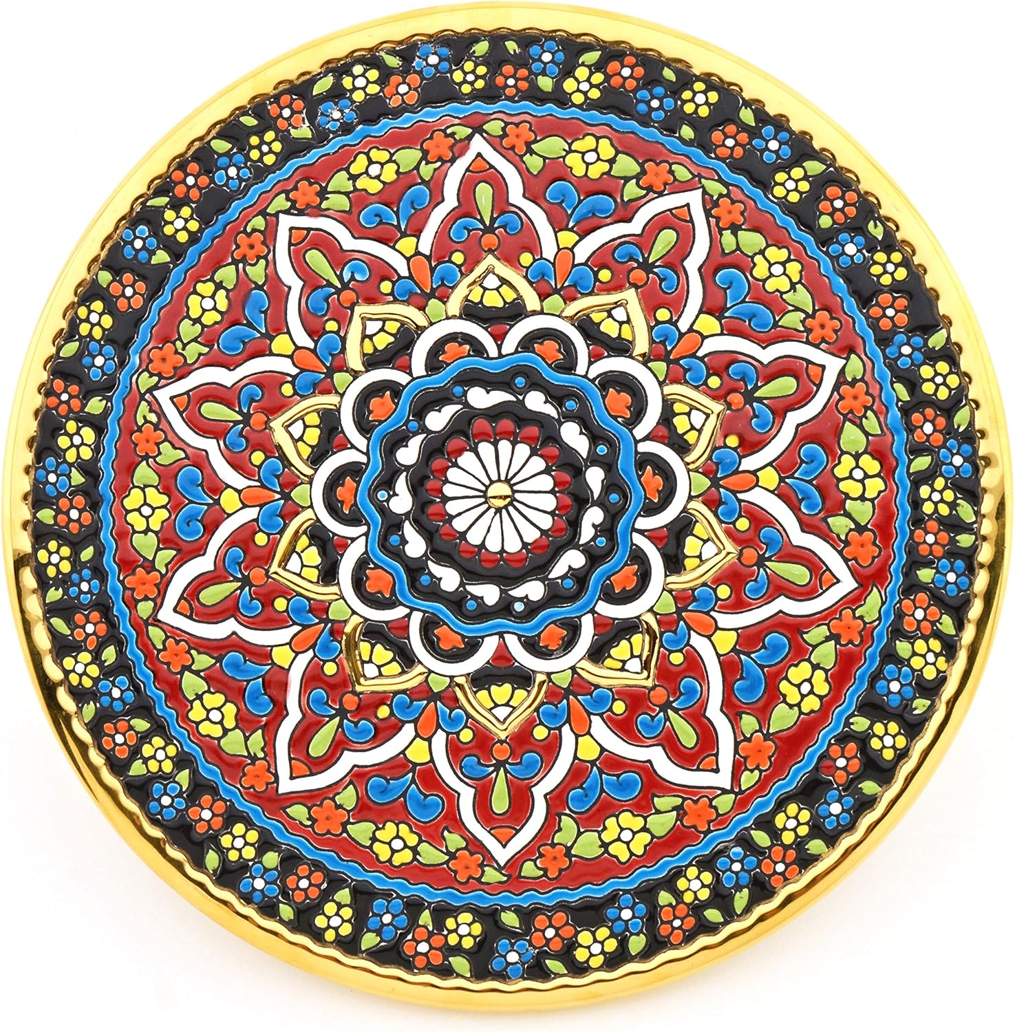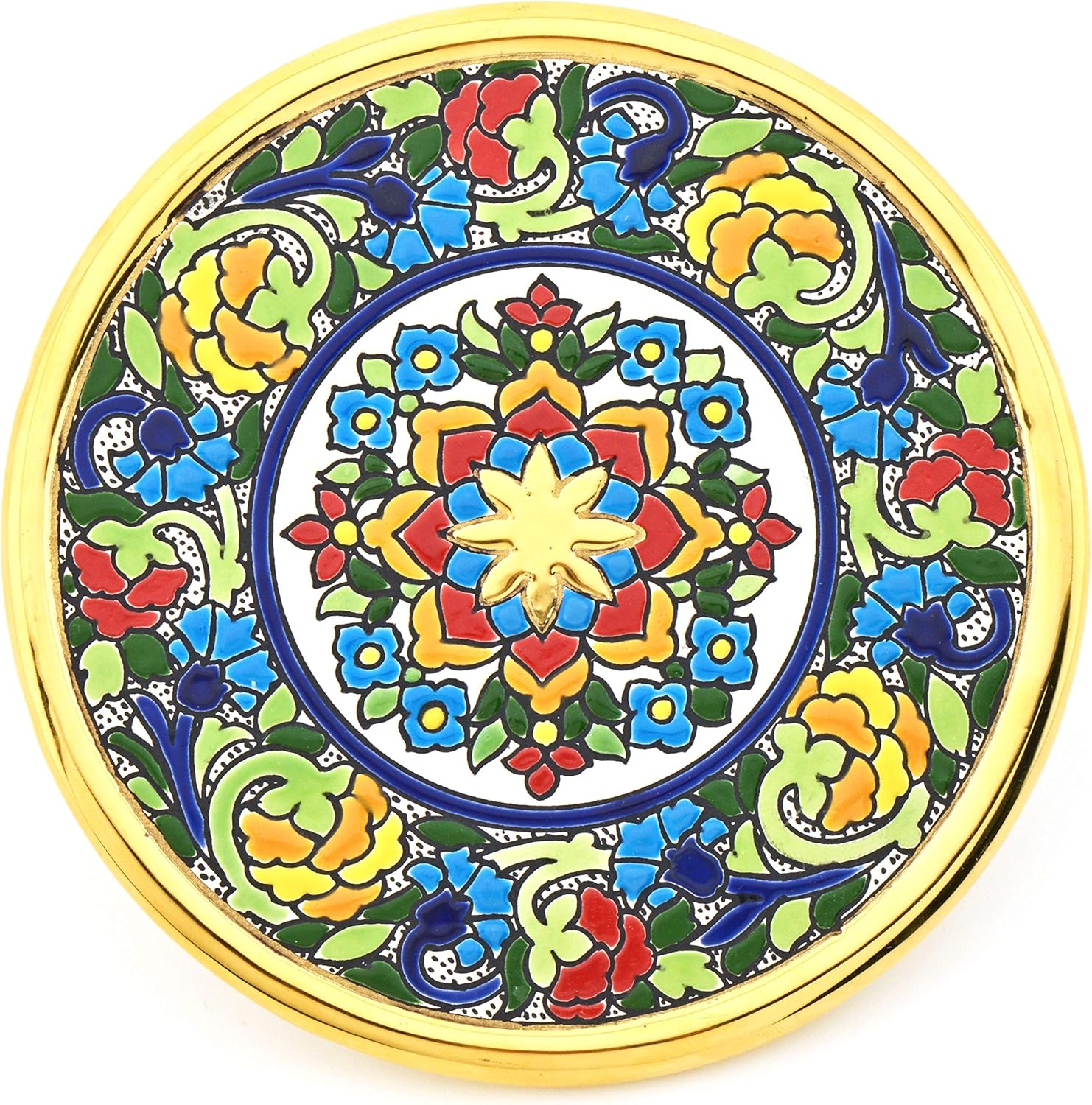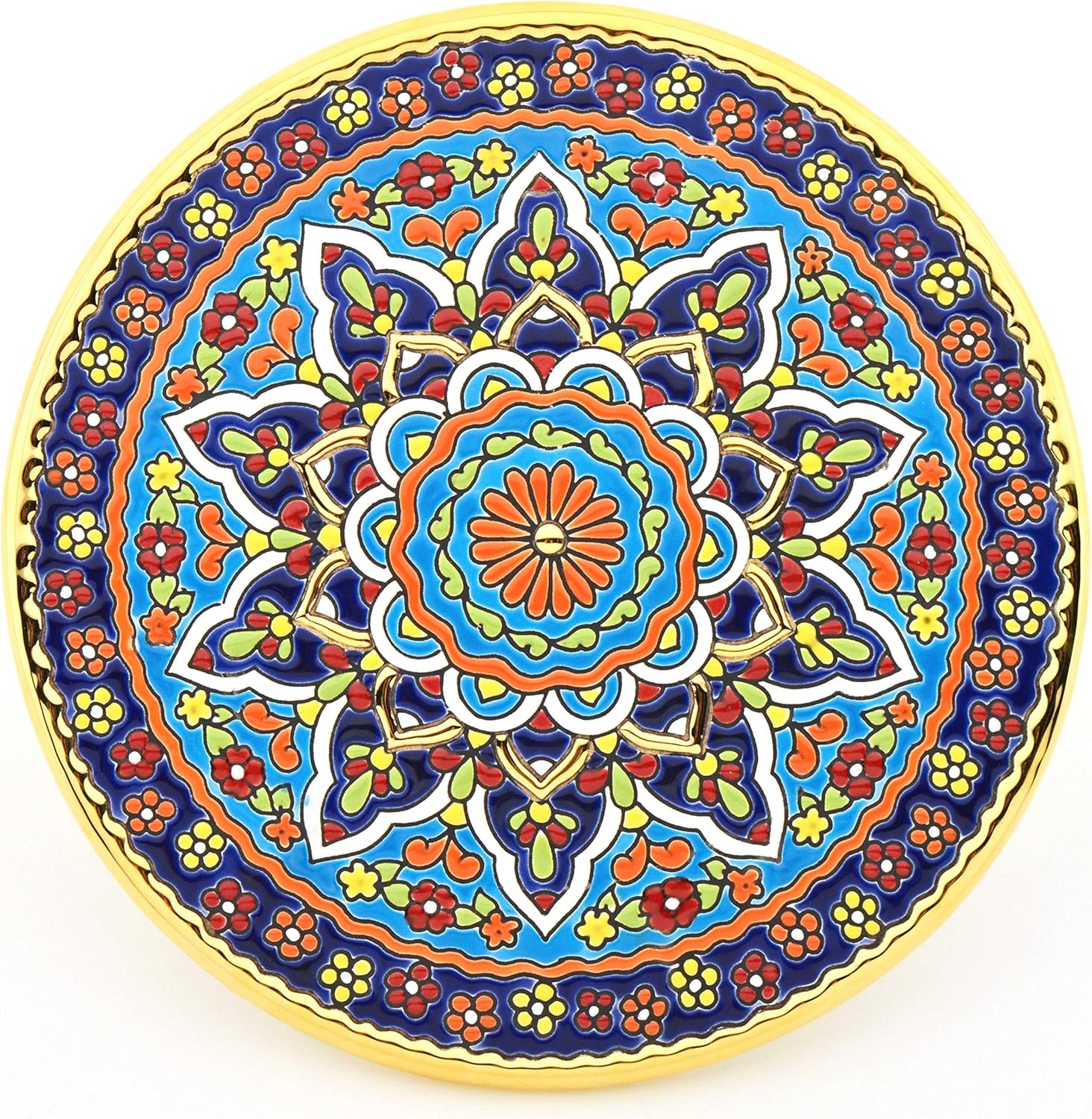 Ceramic decorative plate to hang on the wall (interior or exterior) made with the dry rope techinque, a piece of the best quality and handcrafted, made with enamels cooked in a ceramic oven. This magnificent product is handcrafted in Seville in Spain. An ideal complement to decorate the home. Once the pieces are molded, they are baked at 1070ºC in a special oven. After the first firing, the product is decorated for the first time with all colors except gold, then it is recoated for the second time at 945ºC and then, in the case of products decorated with gold, it is enriched with dissolved liquid gold, with particules resins, which during the third and last firing of 720ºC are burned and leaving only 24 carat gold on the surface. The origin of "Cuerda Seca" (Dry Rope) techinque goes back to medieval times when the great cities of southern Spain, Sevilla, Córdoba, where the main centers of Western art and culture. In this environment expert master ceramists combined two noble materials; gold and enamel, to create extraordinary works of art today appreciated worldwide. The designs of these pieces have a clear geometric muslim influence. Attention: Handpainted pieces. Colours, sizes and shapes may suffer slight differences. Clean with a dry cloth.