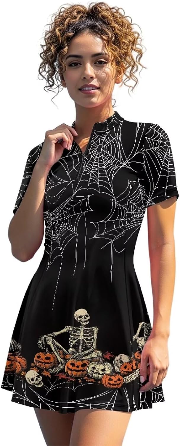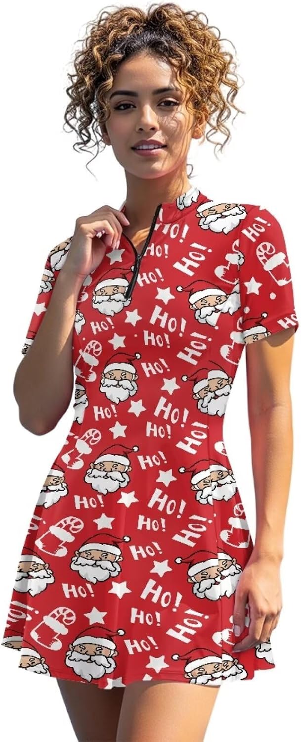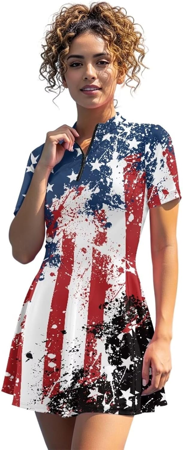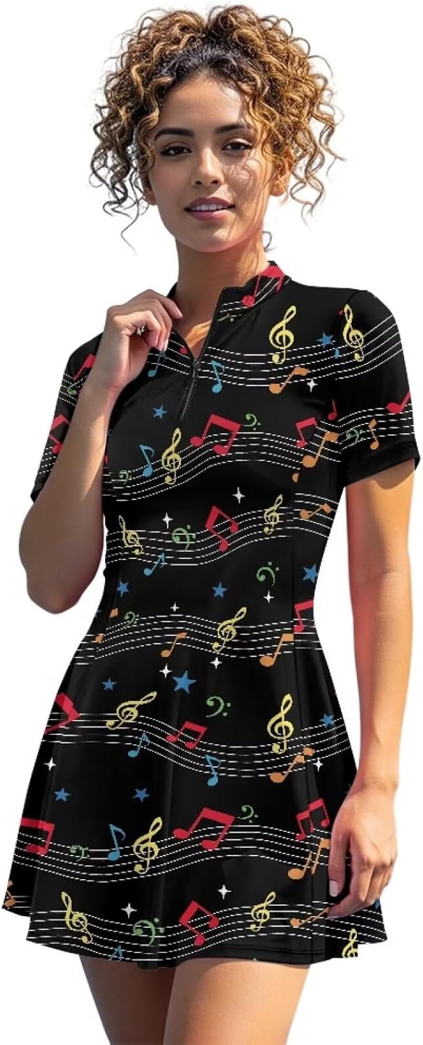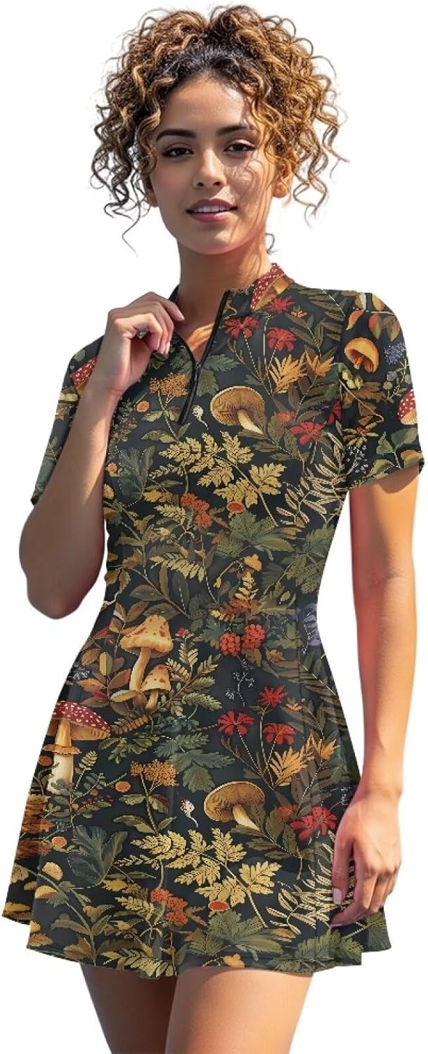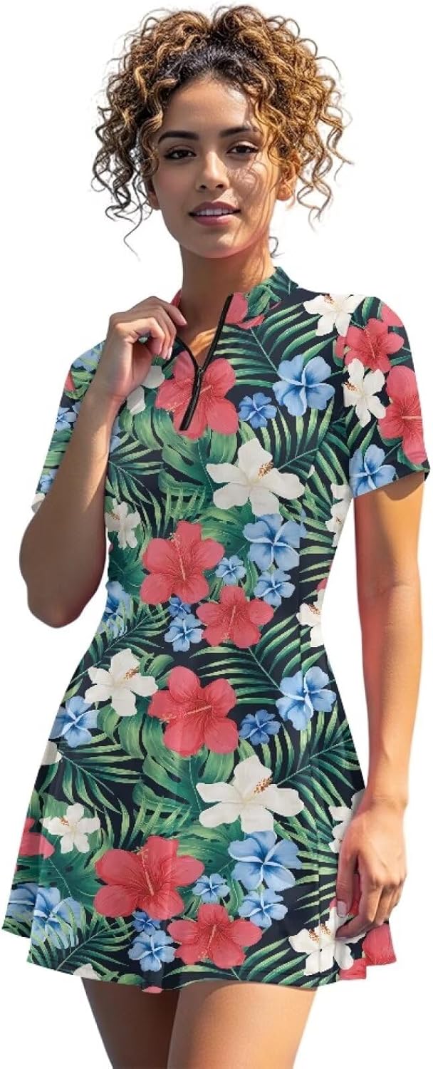 Suhoaziia's Womens Zip Front Tennis Dress V-Neck Short Sleeve Athletic Workout Dresses 2 Pieces Pickleball Golf Outfits Build in Shorts with Pockets About Size (Inch): XS - Dress Length: 31.1''; Bust: 32.28''; Waist: 27.56''; Shorts Length: 12.6'' S - Dress Length: 31.89''; Bust: 33.86''; Waist: 29.13''; Shorts Length: 12.99'' M - Dress Length: 32.68''; Bust: 36.22''; Waist: 31.49''; Shorts Length: 13.39'' L - Dress Length: 33.46''; Bust: 38.58''; Waist: 33.86''; Shorts Length: 13.78'' XL - Dress Length: 34.25''; Bust: 41.73''; Waist: 37.01''; Shorts Length: 14.17'' 2XL - Dress Length: 35.04''; Bust: 44.88''; Waist: 40.16''; Shorts Length: 14.57'' Features: Slim fit, short sleeve, ruffle hem, functional zip-neck collar, short length Novelty Prints: Stylish pattern brings you a new experience, we have a variety of fun print for you to choose from, such as dog paws, hippie flowers, cow print, zebra stripes, sunflower, etc. If you want something different, try our casual sports dresses! Ideal Gifts: Great gift option for yourself, girlfriend, wife, mother, sister, daughter or friends on Birthday, Halloween, Thanksgiving, Christmas, Summer Vacation or Golf Games. Easy to care, suitable for all seasons.