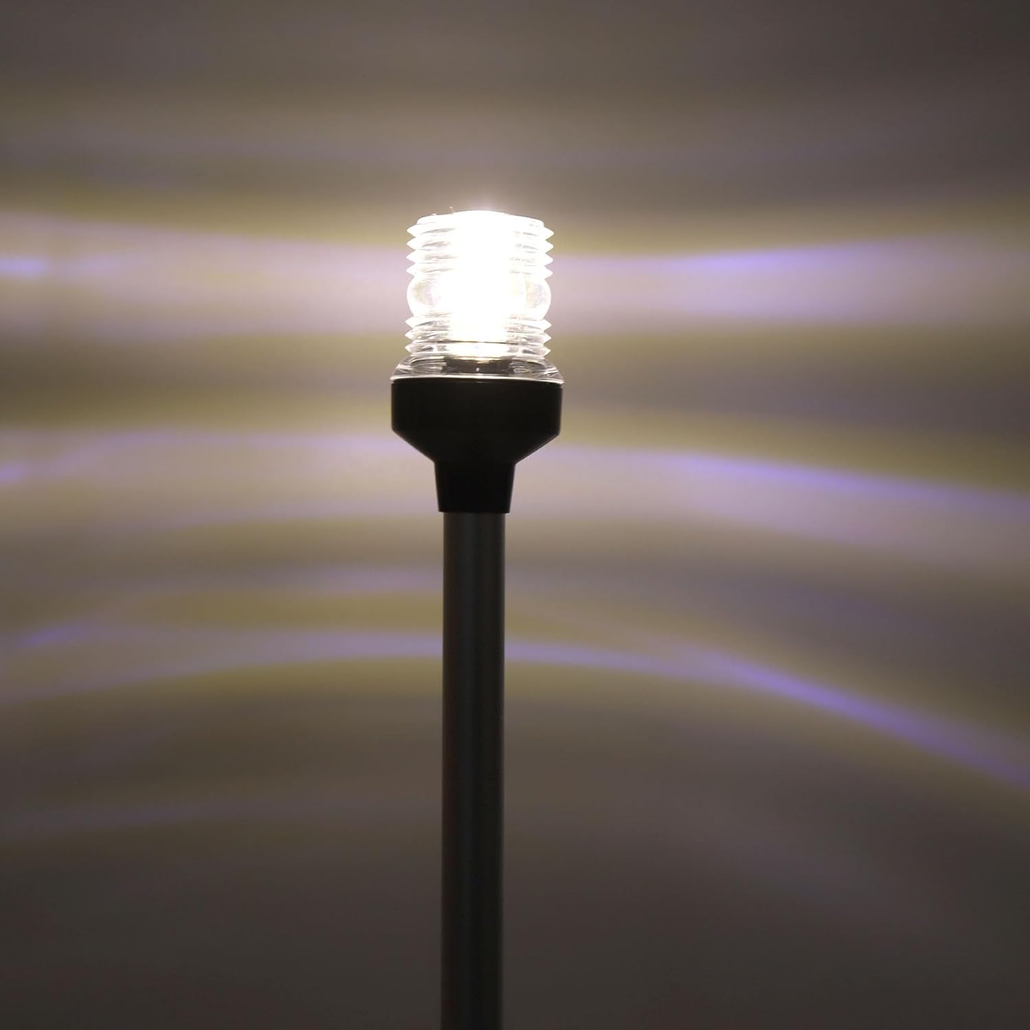 1. 360° All Round: LED anchor light has a round design, which can illuminate the surrounding environment 360 degrees in all directions, enhancing the visibility of the ships. 2. IP66 : Anchor light with ring is completely protected from dust entry, and can withstand the impact of violent waves or strong water spray. 3. High Performance: Lamp with 316 stainless steel base, damage aluminum rod and PC lampshade, and can be used for a long time in high salt, humid environment. 4. Lighting Effect: The warm white 33LEDs can provide sufficient bright illumination effect, so that the ship can clearly identify the direction at night or in low visibility conditions. 5. Practical Light: Masthead navigation light can stand stably in the rough sea, suitable for fishing boats, yachts, ships, etc, perfectly guaranteeing the safety of ships in the complex navigation environment. Spec: Item Type: Boat Anchor Light Material: PC, 316 Stainless steel, aluminum Operating Voltage: DC 12-24V Product Height: 22 inches Visibility: >2NM Number of LEDs: 33 Light Color: Warm white Length of a Single Power Cable: Approx: 1m/3.3ft Wiring: Red connects to positive pole, black connects to negative pole Installation Position: Bow, stern, side of the ship, mast and other arbitrary position Scope of Application: Suitable for marine fishing boats yachts ships PackageList: 1 xLight 2 x Screw 1 x Power Cord